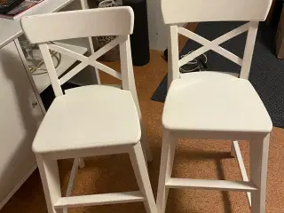 Retro højstol. Hvidmalet. Kan laves om til lav stol med bord og hjul. Trænger til lim og en vask. Fungerer ellers som den skal.