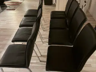 6 spisebordstole med sort kunstlæder sælges, 2 af dem trænger til nyt betræk , sælges samlet.