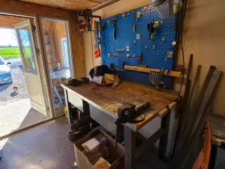 Værkstedsbord med bøgebordplade og skruestik sælges.
