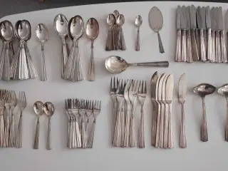 Sælger denne flotte bestik samling, bestående af 17 dele, 1 serveringsske, 6 gafler, 6 spiseskeer og 4 pålægsgaffeler. Prisen er samlet for alle 17 dele