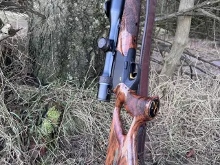 Vekselsystem så mulighed for kaliberskift. Justerbar kindpude. 15x1 Gevind. Fine arabesque graveringer med kronhjort og dåhjort motiver. Krondyrlæder på grebsflader, bagkappe og kindpude