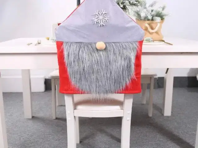 Nye jule-betræk til spisebordsstole Ca 63x50 cm 75kr pr stk Afhentes i 6940 Lem st., eller sendes mod betaling af porto Kan evt tages med til Skjern eller Herning ved lejlighed