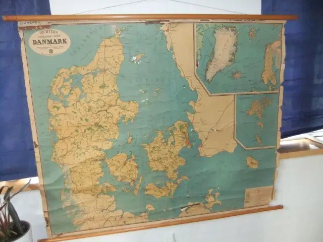 Gammelt Richters Danmarkskort sælges. Rustikt og med nogen slidtage (se eksempler på billederne). Kortet er med træstokke og bagside af lærred. Cirka 155 cm bredt. Jeg gætter på, at kortet er fra 1950'erne, da Langelandsbroen ikke er indtegnet.