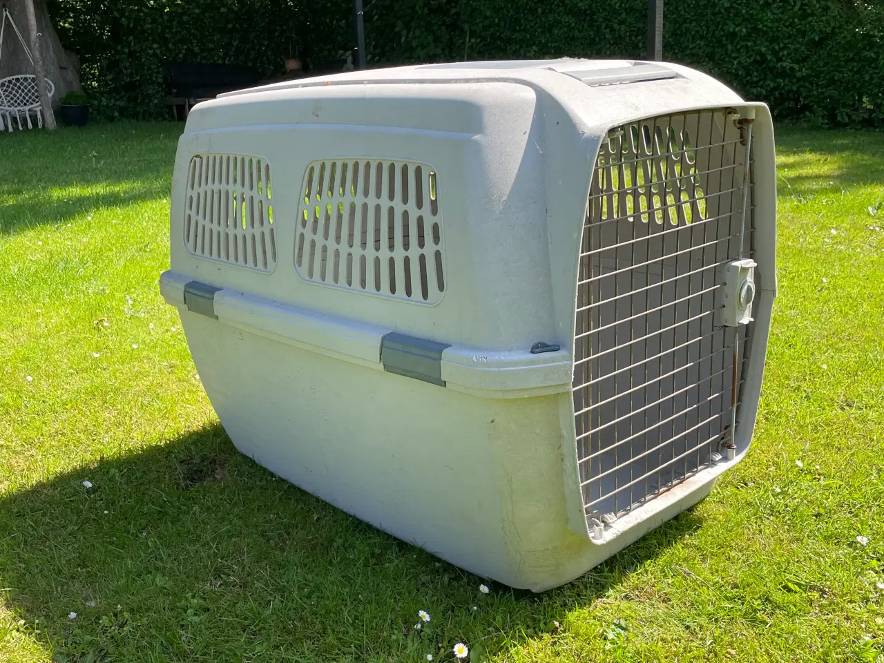Clipper 6 letvægts transportbox i hård plast og metal. Vores schæfer kunne fint være i den.