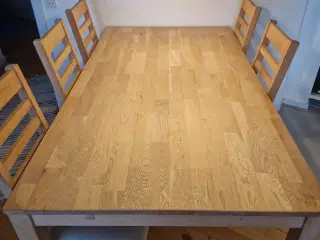 Gammel egetræs bord med nyere stole + 2 tillægsplader i fyr træ , sælges pga.flytning. evt Bud. kan evt leveres