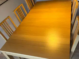 Flot og enkelt spisebord med 4 hvide stole. Perfekt til køkken eller mindre lejlighed. Sættet er brugt, og der er brugsspor på både bordplade og stole (se billeder), men står stadig stabilt og funktionelt. Skal hentes i Skive