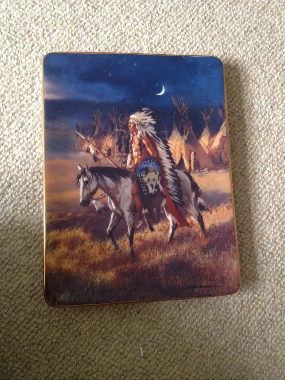 Franklin mint serie med fire platter som til sammen danner et billede, som hedder "the World of the warrior" med hylde. Billederne er nummereret med certifikat limited edition og håndmalet Billederne hedder: Prayer at dawn Victory at dust Day of the hunt Moonligth watch søgeord plat, platter, indianer, samleobjekt, samleobjekter, stamme