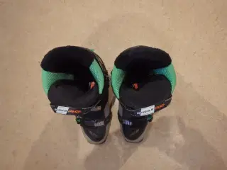 Salomon Performa H6 str.27 Salomon Performa 6 er med en termo modolerbar indersko, aluminiums mikro spænder og en bred strop. Salomon Performa 6 skistøvler er designet til skiløbere, der prioriterer sikkerhed og komfort. Performa 6.0 er lavet til både fritids- og øvede skiløbere og har My CustomFit komfortindersko, Walk inn hæl- og tåpuder for optimal sikkerhed og komfort. Spaceframe-teknologi -giver en blødere yderside for præcision, smidighed og øget føling, en stivere inderside for præcis kontrol og kraft. Salomon Performa Technology skal og skaft. Bi-materiale skal - en bi-injiceret skal, der giver den tilpassede hårdhed. Polypropylen: blødere og lettere materiale end PU; høj UVA modstand med god pris/kvalitetsforhold. Spænder: Mikrospænde - finjusterer spænde-lukningen ved at dreje den del, der griber spændets tænder. Alu-spænde - mere modstandsdygtigt,og eksklusiv finish, accepteret af alle skiløbere, fordi de føler sig trygge og selvsikre. Justering - 35 mm rem - en PVC- eller tekstilrem med Velcro øverst på støvlen, der finjusterer lukningen af støvlen for at give en kraftfuld ben indpakning. Termoformbar tunge for bedre komfort på skinnebenet. Luft-skinne-pude - en stødabsorberende tunge lavet med luft, som giver stor komfort for dit skinneben, så du kan stå på ski hele dagen (en ægte airbag til dit skinneben). Slick fit - et glidende bånd placeret på liner, det er nemt at træde i uden nogen indsats. Størrelsen på skistøvler fungerer ikke som ved almindelige sko. Skistøvler måles i det, der hedder mondo point, som svarer til inderstøvlens længde i centimeter (CM). Det betyder f.eks., at en størrelse 27 har en indersål, der er 27 cm lang. Når det kommer til skistøvler, er præcision ekstra vigtig. Støvlerne skal sidde tæt og kontrolleret, for at give dig god støtte og sikre teknik – og her er det ikke nok blot at omregne fra EU-størrelser. Jeg anbefaler derfor, at du måler din fod i centimeter. Når du har målt længden, så læg 0,5 CM til for et stramt fit,