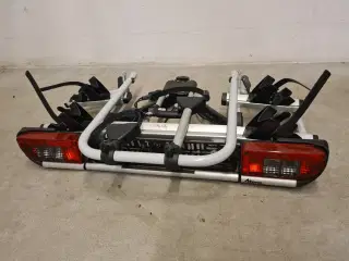Thule EuroWay 921 cykelholder til to cykler. Har nogle år på bagen men fungerer som det skal, dog skal den ene holder strammes med skruenøgle (medfølger). Har spænder til fastgørelse cyklernes hjul. Nem montering med lås (to nøgler). Kan vippes via fodpedal, så man har nem adgang til bagagerum (også med cykler på. Lys virker, stik er 7 polet. 7-13 pol adapter kan følge med.