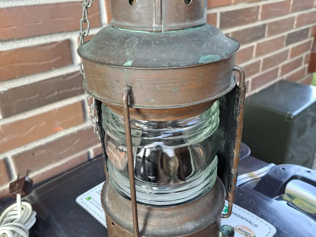 Skibslanterne af kobber - lavet om til el. Den er 38 cm høj og har en lang kæde med. Yderst velholdt. Der kan ikke tydes noget nummer på den, men der står England og noget bagved som ikke kan læses. Den står hos min søster i Vester-Skerninge mellem Faaborg og Svendborg og skal afhentes der. Bud velkomne.