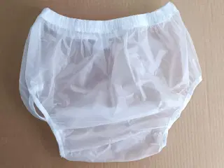 Gummibukser / blebuks til inkontinens. Lækker blød kvalitet i halvgennemsigtig frosted hvis. Størrelsen er angivet som XL, men jeg vil kalde dem L (livvidde 85-100 cm) Se venligst målskemaet, idet der jo er forskel på, om man har en ble på, eller ønsker at bære dem alene. De er selvfølgelig fabriksnye og ubrugte ! KUN SERIØSE HENVENDELSER ! TAK ! Sender gerne med f.eks. DAO FS2026-02
