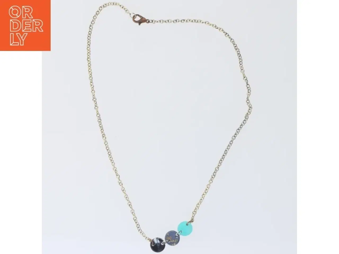 Klik på 'Se annoncen hos forhandleren' for at se varen i vores webshop Denne halskæde består af en tynd, guldtonet kæde og er dekoreret med fire små, runde sten i forskellige farver og mønstre. Stenene er arrangeret i en horisontal linje og er i farverne blå, grøn og grå. Halskæden lukkes med en lille karabinlås. Brand: Ukendt Farve: Guld Stand: 60 - Varen har mindre spor fra almindelig brug (Se billeder) Vi sender til hele landet for 49 kr. Leveringstiden er 1-3 hverdage. Du kan også gratis hente den på vores lager på Industrivej 10 i Slangerup. Er du i tvivl om varen stadig er til salg? Klik på knappen "Se annoncen hos forhandleren" for at se den i vores webshop. Kan du se den der, er den stadig til salg Orderly er en ny måde at købe brugt på. Vi har alle vores sælgeres ting på vores centrale lager. Derfor kan du være helt sikker på at få dine ting - og du kan samle flere ting på tværs af sælgere og kun betale én gang fragt.