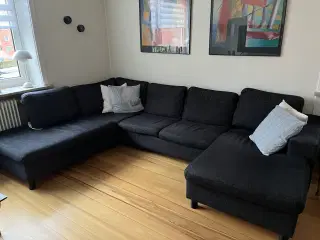 Mørk grå stof og sorte ben. 2,30x2,70. Sædehøjde 42 cm. Totalhøjde 95 cm. Sælges pga flytning.