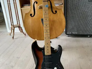 Stratocaster kopi. Kender ikke mærket. Stemmeskruer ligner Harley Benton, men headstock ligner ikke nuværende Harley Benton ST modeller. Har mærker i lakken. Spiller faktisk ok.