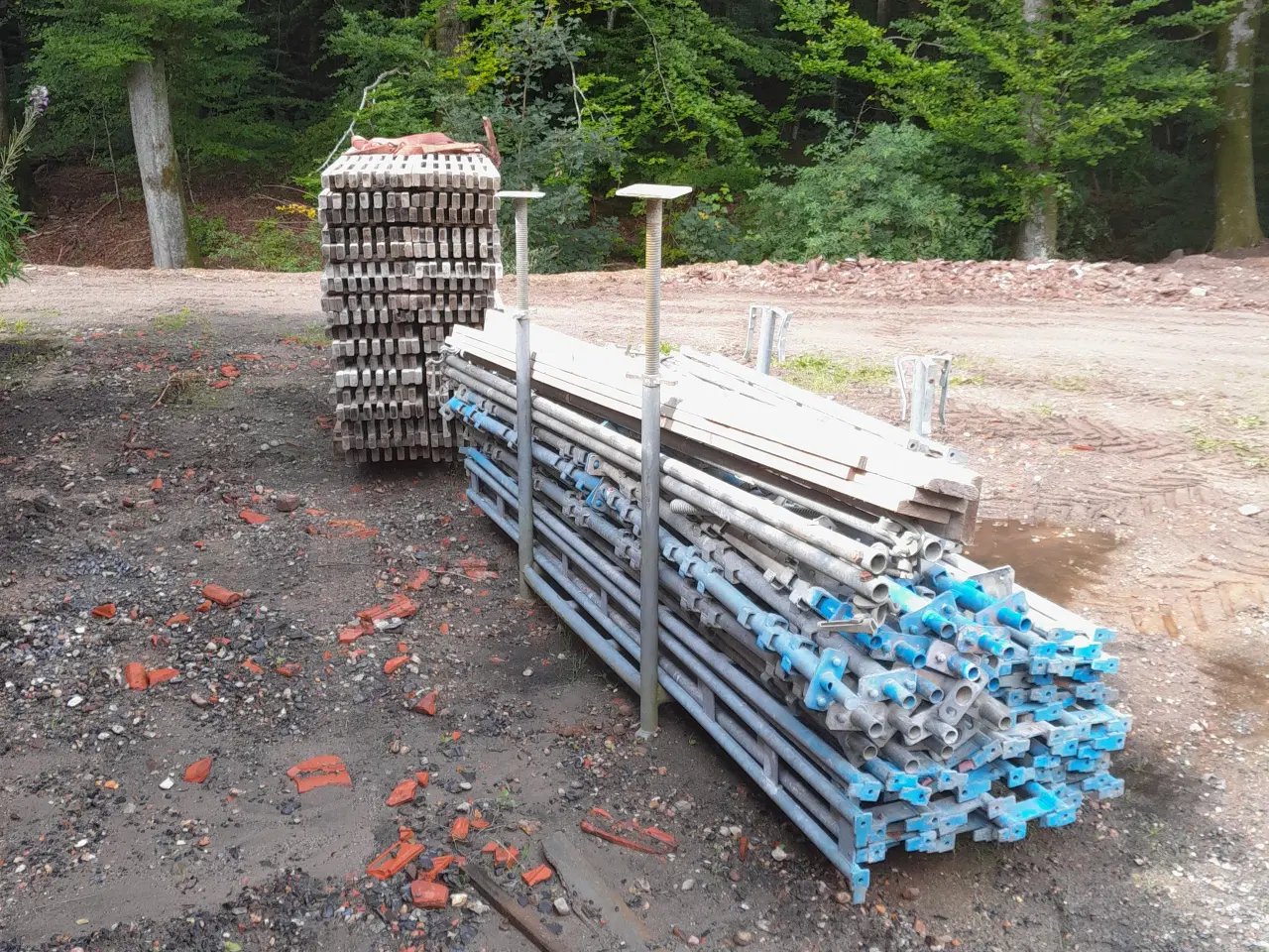 Haki stillads 9 meter bredt , 6 meter ståhøjde ( arbejdshøjde 8 meter ), komplet med 24 ergo traller , vanger , ben , fødder , korte/lange kryds , låsebrædder +låse , forankringer til mur ,