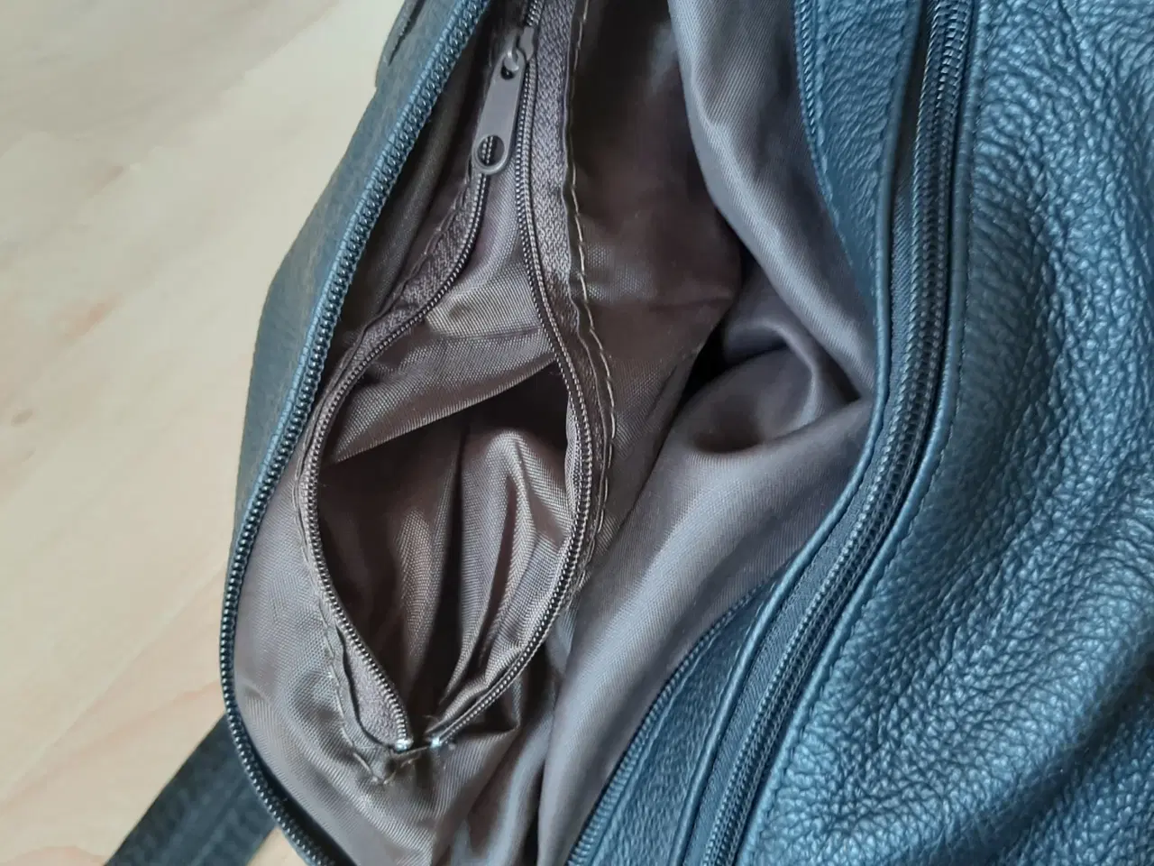Rigtig flot sort læder taske med skulder strop som kan lynes op så den kan bruges som lille rygsæk. Kan ses i Pandrup.