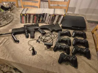 PS3 (slim) sælges inkl. 2 controllere. 14 spil medfølger i prisen.