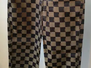 Superflotte mønstrede bukser - ikke brugt. De lukkes med lynlås i siden, der er ingen lommer Materiale: 88% Polyester, 12% Elastane Mål: Livvidde: 88 cm Længde: 102 cm Indvendig benlængde: 75,5 cm Fra skridt til liv fortil: 28 cm Fra skridt til liv bagtil: 40 cm Lårvidde: 64 cm Vidde bukseben: 34 cm Bud fra kr 800 plus porto Afhentning: København, Østerbro