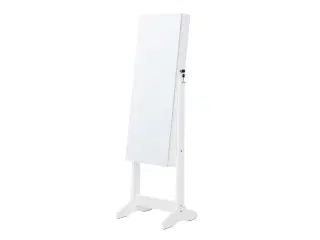 ELEGANT SMYKKESKAB MED RAMMELØST SPEJL Få overblik over hele outfittet med det rammeløse, fuldlængde spejl på 37 × 108 cm i ægte glas. Indvendigt tændes 6 LED-lys automatisk, når døren åbnes, så dine smykker præsenteres klart og indbydende – perfekt til soveværelset eller garderoben. STOR OG LÅSBAR SMYKKEOPBEVARING Det låsbare skab rummer alt fra hverdagsfavoritter til festlige accessoires: 84 ringpladser, 32 kroge til halskæder, 48 huller og 90 pladser til øreringe, 1 tørklædestang, 5 hylder samt 2 skuffer til dine skønhedshemmeligheder. Den gennemførte indretning gør det let at holde orden og beskytter dine smykker mod filtrering og støv. FLEKSIBEL MONTERING – VÆG ELLER DØR Skabet kan hænges på en dør med de medfølgende kroge eller fastgøres på en solid væg med skruer. Bemærk: Den medfølgende dørokrog passer ikke til døre på 14 mm tykkelse eller mere.
