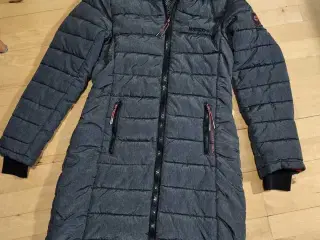 Super smuk overgangsfrakke fra Danefæ, i støvet mørkeblå, med bredstribet bomuldsfoer i mørkeblå/rød, mørkeblå satinfoer i bund og todelt rød lynlås. Balloneffekt i ærmer og bund, bredt bindebånd i taljen, gode store puf-lommer med burretape og stor hætte med snørrer i løbegang. Frakken har generelt et pænt og i orden udtryk og fejler intet, men går man efter med luppen, vil der være lidt naturlige tegn på brug, som lidt fnuller i burretape ved lommer og under ærmer, lidt rød maling der er slidt af ved lynlåseglideren og snørrene der er falmet lidt, Danefæ logoet står heller ikke helt skarpt i nakken længere, men intet af reel betydning. Længde: 98cm Brystomkreds: 112cm Taljeomkreds: 98cm Skulderbredde: 44cm Fra røg- og dyrefrit hjem