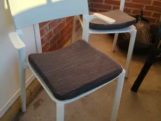 med betræk af sort læder/kunstlæder. Der er stabelmærker på sæderne, som måske/måske ikke forsvinder med tiden. På en af stolene er syningen i toppen af ryglænet gået i stykker. Prisen er for alle 4.