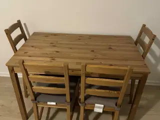 Spisebordet har en højde på 74 cm. Der har været en voksdug på fra starten af, for at passe bedst muligt på det. Stolene har hvid skal og et stel af metal. De har en siddehøjde på 45 cm. Der medfølger 2 hynder af gråt stof og 2 i ”læderlook”. Sættet er i meget flot stand. Sælges blot på grund af fornyelse.