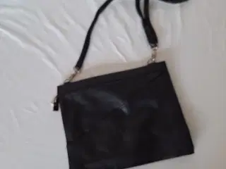 Lille taske til hverdag og ferie Med aftagelig justerbar skulderrem Farve: Sort Materiale: PU-læder Med 4 lommer inde og 2 lommer udenfor Str. 20 cm x 14 cm x 6 cm Brugt men god, fejler intet