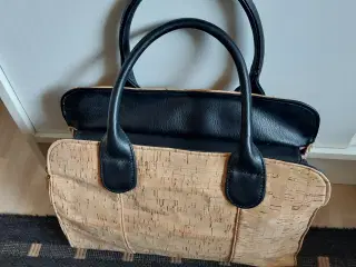 Lille fiks skuldertaske udført i kanvas/rattan/tov samt læder. Foret med mønstret provence stof. Hård skal. Fremtræder som ny.