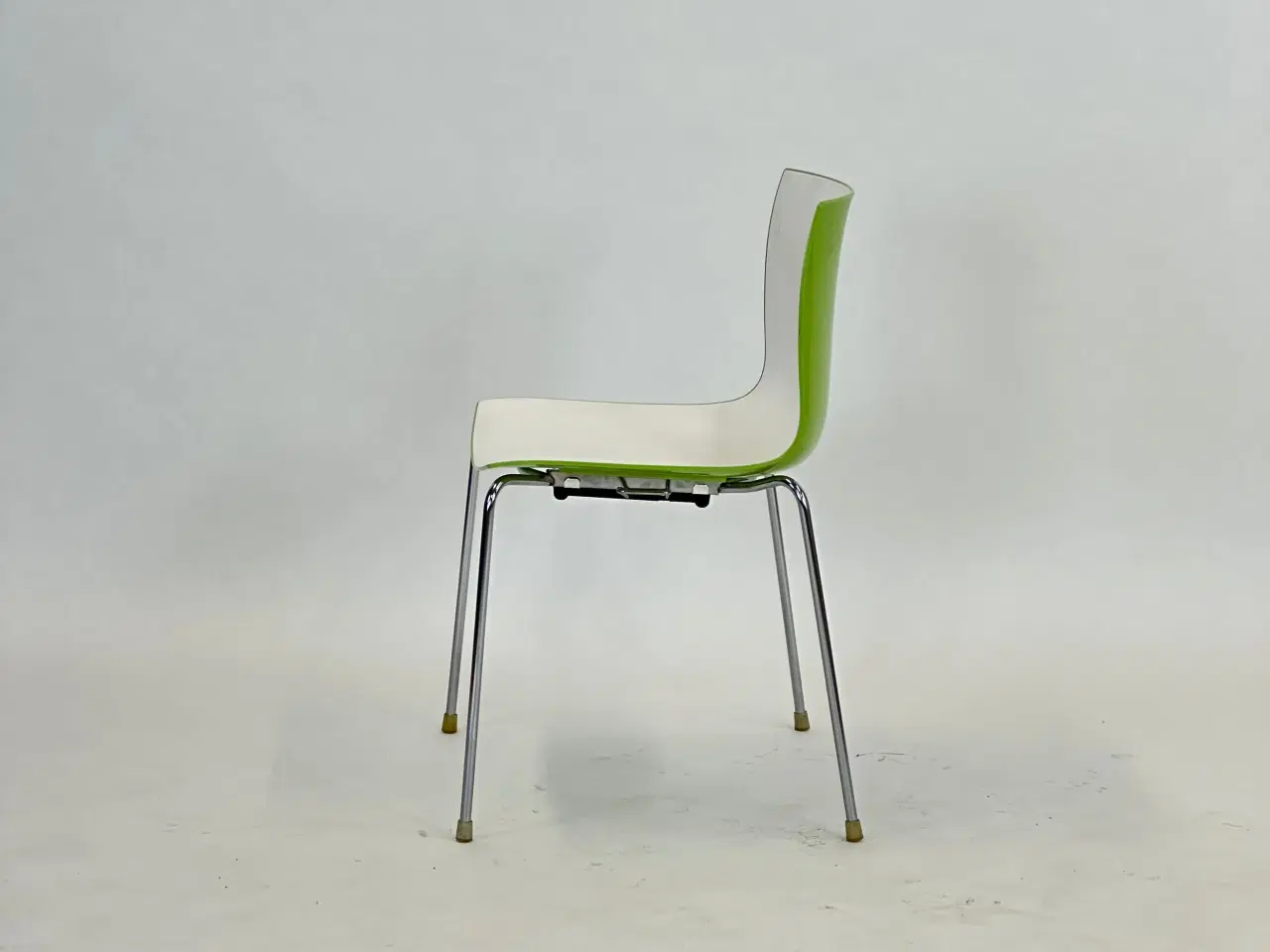 Catifa 46 Konferencestol fra Arper – Tidløst Design og FunktionalitetCatifa 46 konferencestolen fra Arper er et symbol på moderne elegance og alsidighed. Med sit minimalistiske design og raffinerede detaljer er denne stol perfekt til professionelle miljøer, hvor både stil og funktionalitet vægtes højt.Design og MaterialerSæde: Stolens formstøbte skal er fremstillet i slidstærkt plast, som giver en let og elegant fremtoning. Den hvide farve med en subtil grøn bagside tilføjer et unikt visuelt touch.Stel: Stellet er fremstillet i forkromet metal, der sikrer stabilitet og et moderne udtryk. Benenes afslutninger har små gummipuder, der beskytter gulve mod ridser.Funktioner Ergonomisk Form: Den let kurvede skal giver optimal siddekomfort, selv ved længerevarende brug.Letvægt: Stolens lette konstruktion gør den nem at flytte rundt og tilpasse til forskellige rumindretninger.Stablebar: Perfekt til konferencer, mødelokaler eller større events, hvor der er behov for fleksibilitet i indretningen.AnvendelsesmulighederKonferencer: Stolens moderne design og komfortable siddeoplevelse gør den ideel til lange møder eller præsentationer.Kantiner: Den lette vedligeholdelse og robuste materialer gør Catifa 46 velegnet til spiseområder.Kontorer: En alsidig løsning til mødelokaler eller fleksible arbejdsområder.Catifa 46 konferencestolen fra Arper er en kombination af tidløst design og praktiske egenskaber. Med dens komfortable form og stilrene udtryk er den et ideelt valg til professionelle miljøer, hvor kvalitet og æstetik går hånd i hånd.Dette er et brugt møbel fra en dansk virksomhed, hvilket betyder, at der kan være små brugsspor. Alle møbler er dog omhyggeligt renset og gennemgået for at sikre, at de lever op til høje standarder for både kvalitet og æstetik.