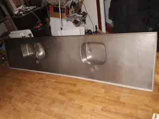 Jeg har 2 massive bordplader i med vaske til salg Mål på den første 205 cm lang 60cm bred 500 kr stk
