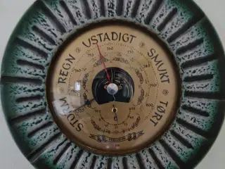 Ur og barometer på en bund af egetræ med messing finish. På urskiven er uret sammensat af romertal. Materialet er lakeret egetræsbund med små markører på siderne af forgyldt messing. 32 cm længde og 17 cm i bredde.