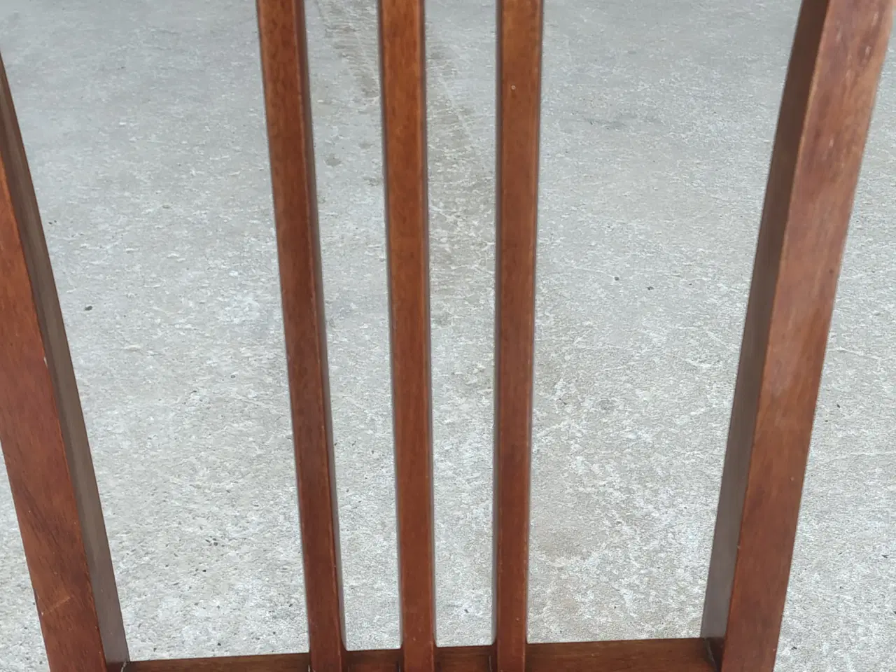 Fin gammel mahognistol. Ryggen er lige med 3 tværpinde og udsmykket med fint mønster i toppen. Desuden ornamenter på stolens 2 forben, som desuden er udstyret med benkapper i metal. Sædet med smukt mønster, men slidt. Bunden fin og intakt. Sædehøjde 47 cm. BYD GERNE.