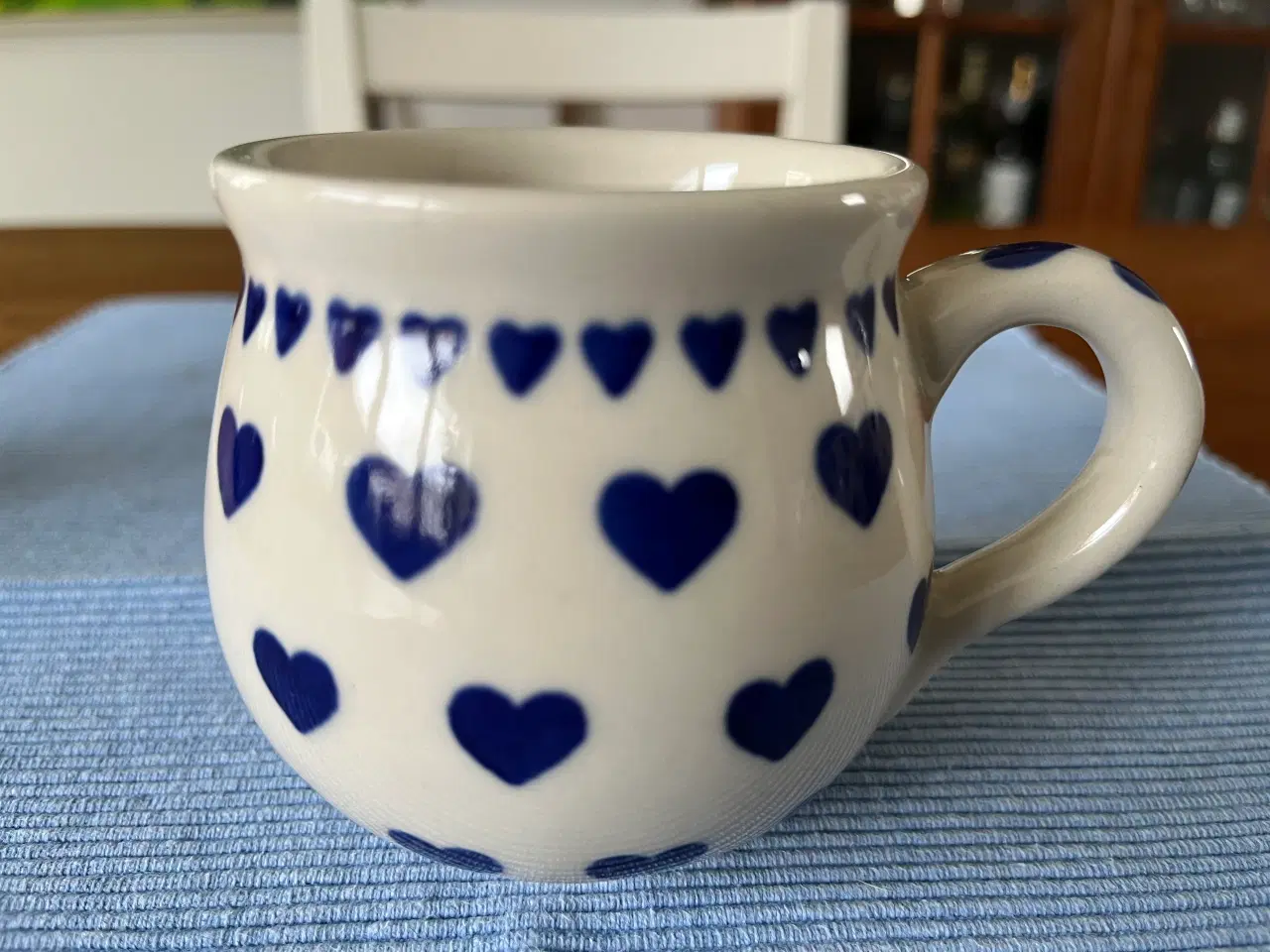 Håndlavet krus i keramik og stentøj , Hvidt med motiv i blå nuancer. Unik design der har opnået flere internationale priser. 1. kvalitets stentøj. Høj brænde temperatur (1250°) gør at servicet er vandtæt og holdbart samt at det kan bruges i ovn, microovn samt opvaskemaskine. Krusene er varme bestandige og indeholder ikke kadmium og bly