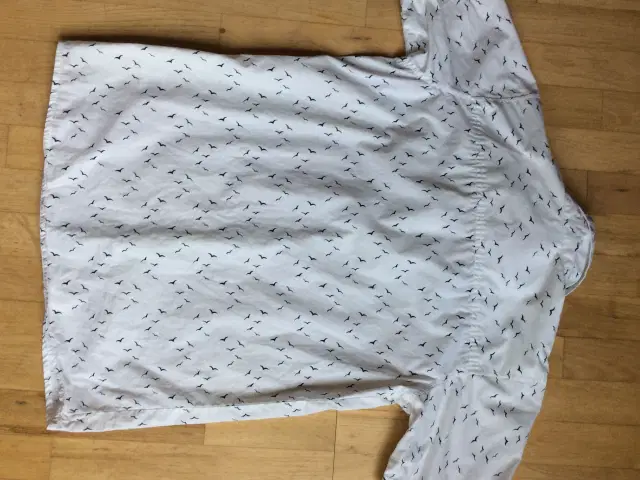 Flot kortærmet skjorte fra DWG. Hvid med mørkeblå ( sorte, svært at se ) fugle. Str. 16 Brugt få gange Fra røg- og dyrefrit hjem. Pris forslag kr. 45,-