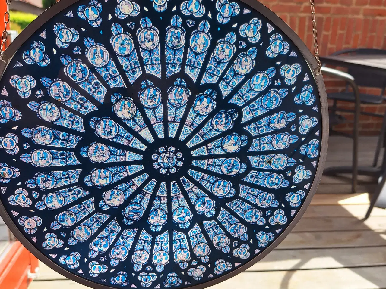 Meget smuk og dekorativ "reproduktion": Glassmasters North Rose Window Nortre Dame Cathedral farvet glas. Fuldstændig intakt solfanger med diameter på 32 cm. Tilsvarende, der bliver solgt på nettet for højere priser, måler kun 16,5 cm i diameter. Lige til at hænge op i et vindue. PS: Kæden en intakt modsat andre af denne type solfangere, der annonceret til salg!