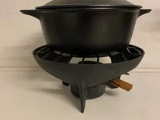 et lækkert smedejerns fonduesæt, den er beklædt med cremefarvet porcelæn indeni, har to træhåndtag i bøgetræ, samt foden på fonduesættet er også i bøgetræ, den er i rigtig god stand og brugt få gange, der hører tre matchende små skåle.