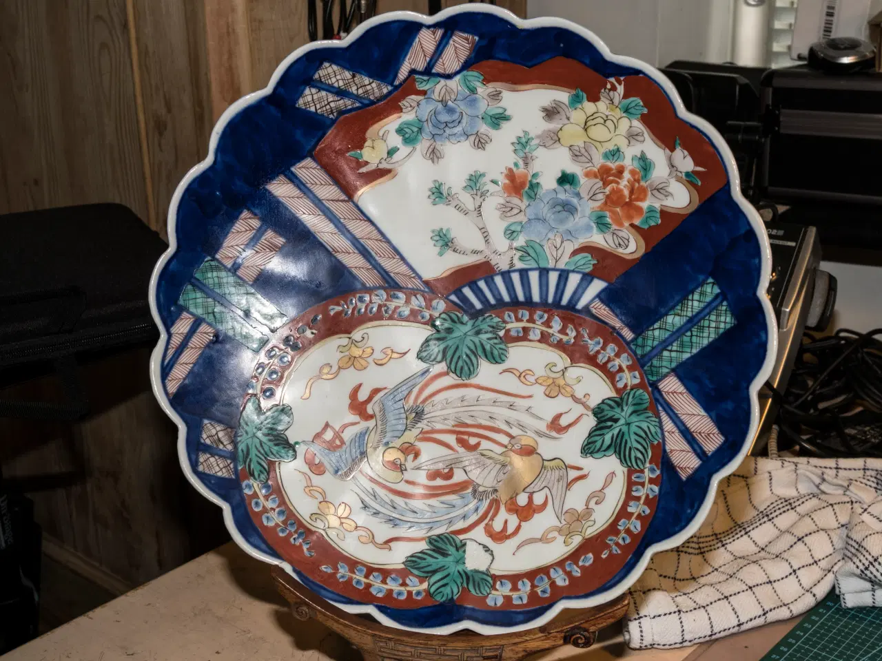 Imari Fad, Japan . Anno 1820. Ø 32 cm. Musling - kant. Ja det står på en lille seddel på fadet. Hvad er det værd? Sælges for humanitær organisation.