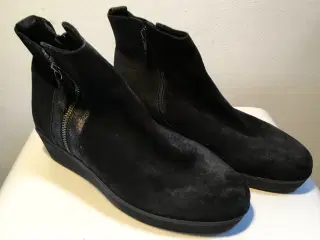 Superflotte og anderledes støvletter i skind med skrå bånd i lilla, der er lynlås i siden Den indvendige længde er 25 cm, hælen er 7 cm høj, selve skaftet er 11,5 cm, skaftvidde er 26 cm Bud fra kr 500 plus porto Afhentning: København, Østerbro