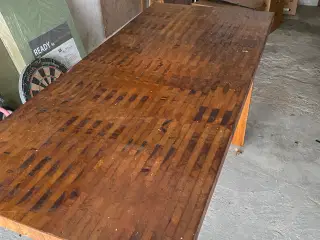 Ældre Spisebord med udtræk. Størrelse 80x120 cm, med udtræk op til 80x220 cm. Hver udtræk er på 50 cm. Firkantede ben. Brugsmærker på bordplade - se billeder. Look a like teaktræ.