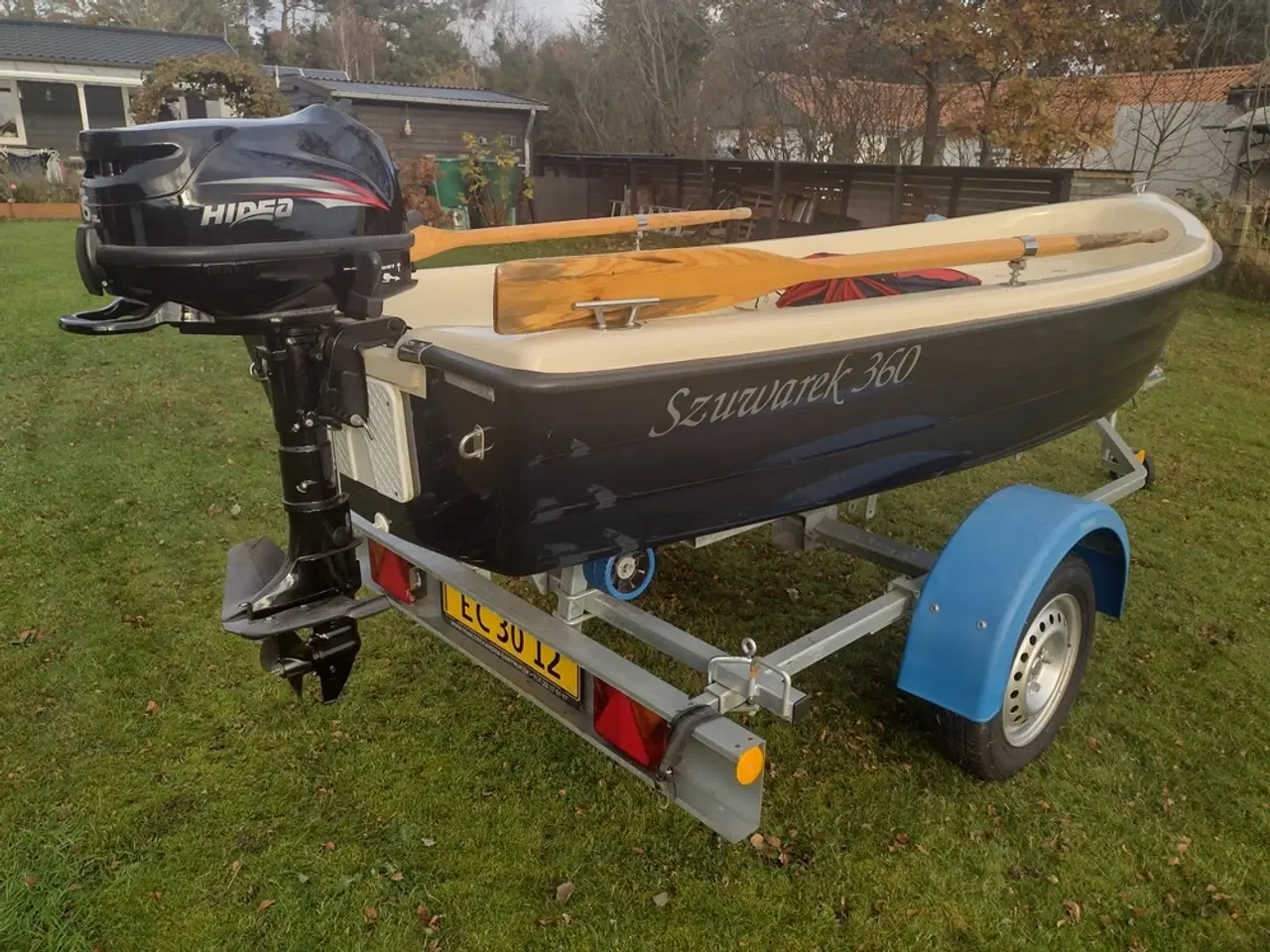 Flot 12 fods SeExplore 360 robåd med Hidea 6 HK, 4 takts påhængsmotor med ny gear og motorolie. Der medfølger desuden en flot 500 kg. bådtrailer samt årer, bundmåtte af gummi, 2 redningsveste, anker samt sækkevogn til bådmotoren.