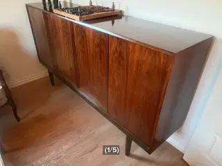 Stor flot skænk i teak træ og messing fra Faarup Møbelfabrik, designer Kurt Løving. Længde 190 cm, højde 110 cm.