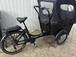 Winther Kangaroo ladcykel med el. Cyklen er fra 2006, og er løbende vedligeholdt og fornyet. Den har fået eftermonteret en krankmotor. En lovlig 250 W. Har kun kørt 1300 km samlet. Har fået ny kæde, og kalechen er heller ikke mange år gammel. Batteriet er 36 V, et stort batteri på hele 19 ah - der er mange kilometer i det. Det er to år gammelt. Skivebremse foran, V-bremse bagpå. Kører fantastisk, med flot kaleche og to siddepladser med seler. Købt som beset.