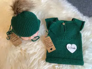 Håndstrikket sæt i lækkert kløfrit merinogarn: DROPS Baby Merino, der kan vaskes i maskine. Sættet består af bluse / top, rilletrøje samt hue med kvast påsat med tryklås, så den kan knappes af ved vask. Sættet er str. ca 1/2 - 1 år. Befinder sig i 9430 Vadum. Kan sendes for 45 kr til en pakkeshop.