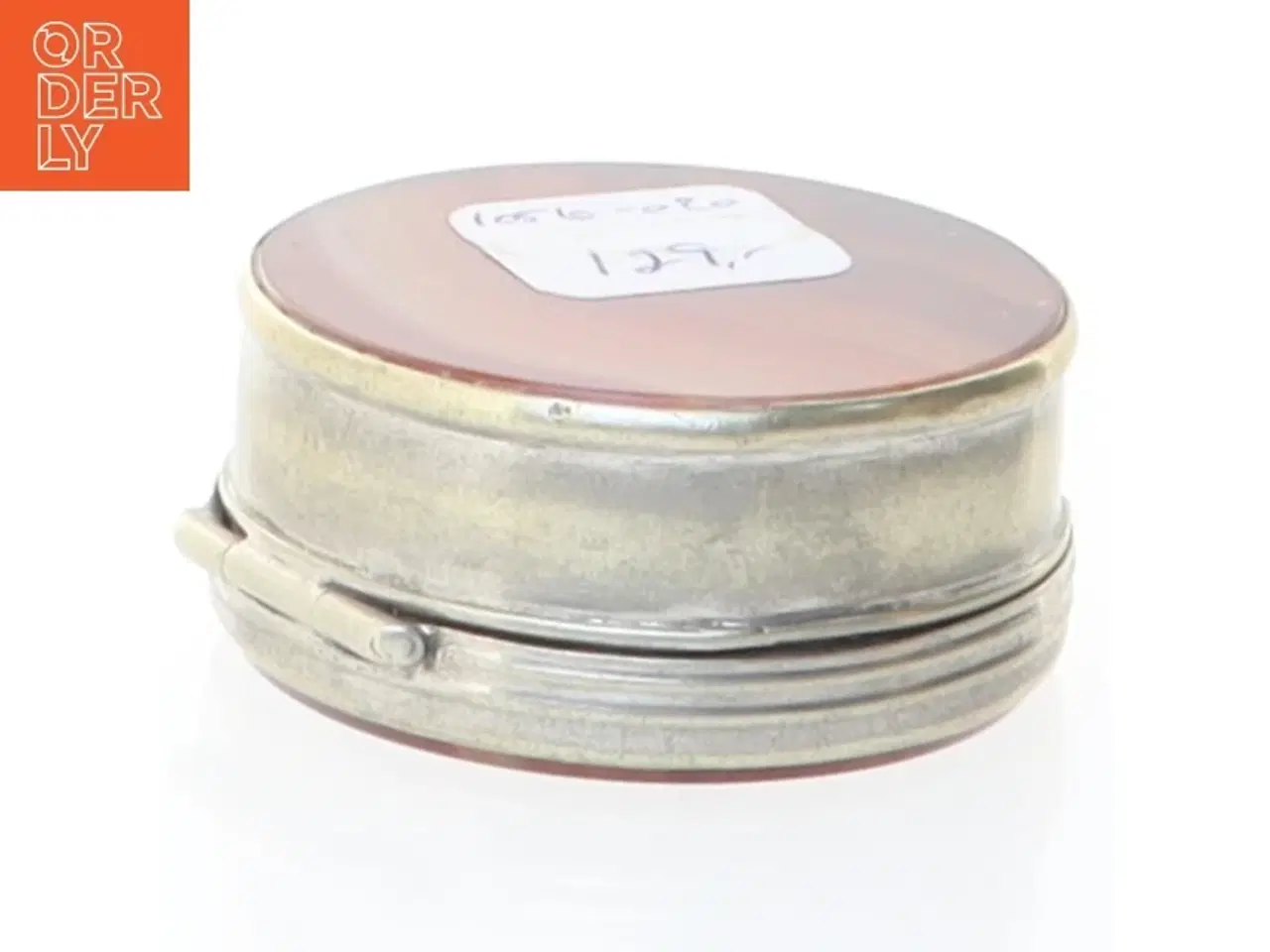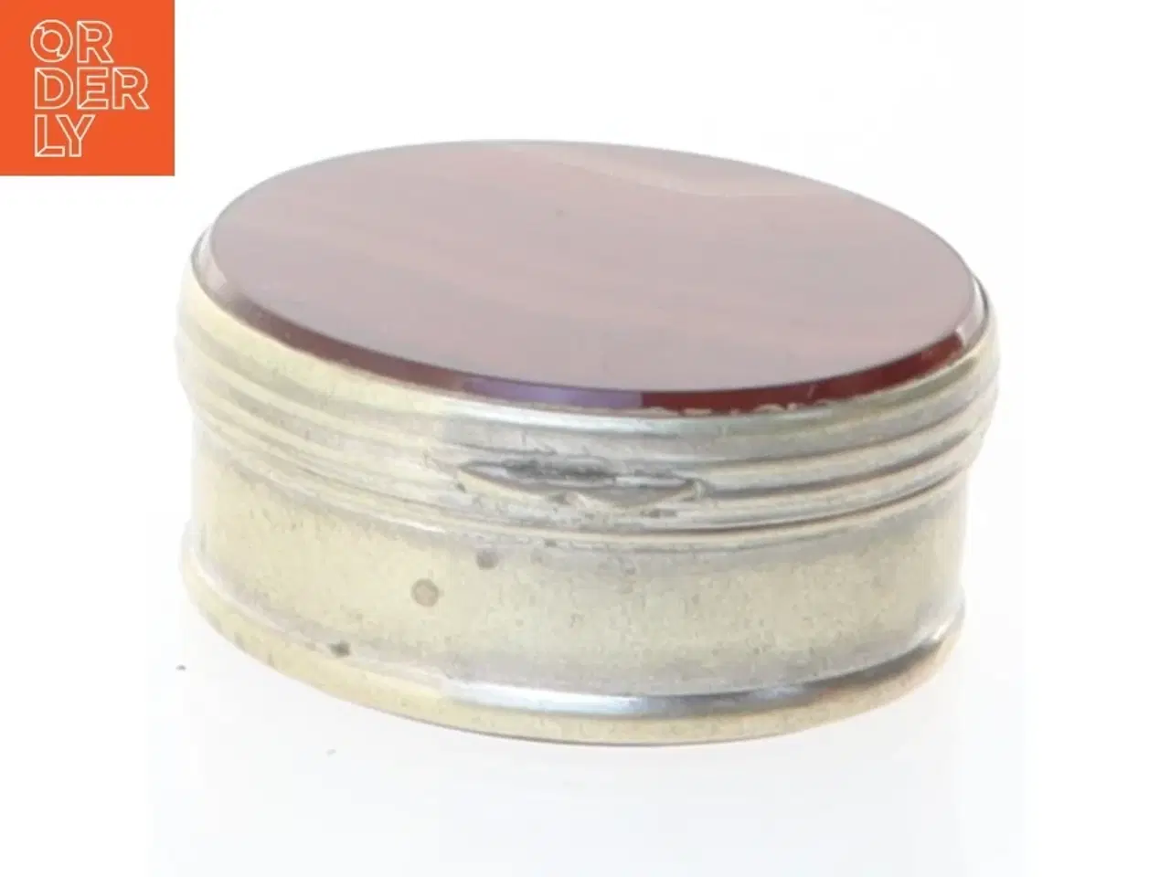 Klik på 'Se annoncen hos forhandleren' for at se varen i vores webshop En rund antik dåse bestående af en sølvfarvet metalramme og et låg med et indlejret bånd af agatsten. Agaten har varme orange og brune striber. Dåsen åbner og lukker med et hængsel, og indvendigt er der plads til opbevaring af snus eller andre små genstande. Brand: Ukendt Farve: Orange Stand: 60 - Vi sender til hele landet for 49 kr. Leveringstiden er 1-3 hverdage. Du kan også gratis hente den på vores lager på Industrivej 10 i Slangerup. Er du i tvivl om varen stadig er til salg? Klik på knappen "Se annoncen hos forhandleren" for at se den i vores webshop. Kan du se den der, er den stadig til salg Orderly er en ny måde at købe brugt på. Vi har alle vores sælgeres ting på vores centrale lager. Derfor kan du være helt sikker på at få dine ting - og du kan samle flere ting på tværs af sælgere og kun betale én gang fragt.