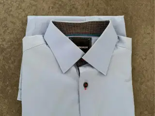 Skjorte - lysblå/hvid i meget smalle striber - mærke=Marcus - str S. Kun brugt een gang. Som ny.