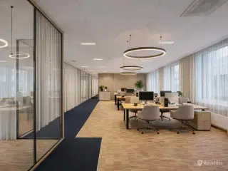 På 1. sal i Theodora Hus på Bryggernes Plads 2 får I et unikt kontorlejemål på i alt 629 m², hvor råt industrielt islæt møder moderne komfort. Det åbne kontorlandskab har højt til loftet, rå murstensvægge, synlige ventilationskanaler og flotte gennemgående betongulve. Her er glasvægge med sorte stålprofiler, der elegant deler rummet op i fleksible zoner til teams, stillearbejdsmiljøer eller kreative projektrum, samtidig med at dagslyset frit kan strømme gennem hele lejemålet. Mod gårdhaven er der store vinduespartier, som trækker både udsigt og grønne omgivelser helt ind i arbejdsmiljøet, mens det centrale serviceområde med tekøkken og flere toiletter sikrer en gennemtænkt arbejdsdag. Det separate køkken-/kantineafsnit er indrettet med skabsplads, køl/fryseskab og træbordplade – det perfekte sted til både morgenmøder og frokostpauser med udsigt til den frodige gårdhave. Lejemålet ligger i Theodora Hus, lige ved den ikoniske Elefantport, som er opkaldt efter Carlsbergs grundlæggers datter. Ejendommen tilbyder adgang til fælles parkeringskælder og cykelparkering. Med dette lejemål får I et inspirerende, fleksibelt og sammenhængende kontormiljø midt i hjertet af Københavns nye bykvarter.