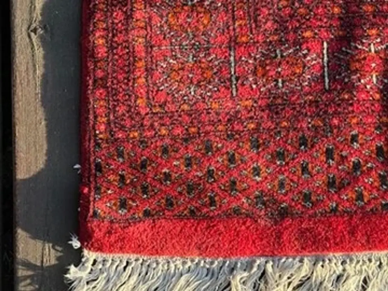 Et meget flot tæppe, men kraftige rød farve Lidt forskel på frønser i enderne - men er velfungerende 150 x 92 cm uden frøns 160 x 92 cm med frøns