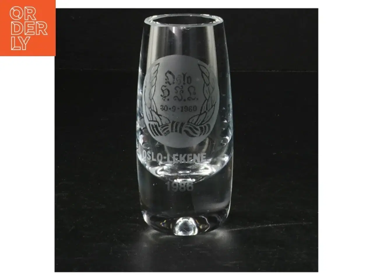 Klik på 'Se annoncen hos forhandleren' for at se varen i vores webshop Et gennemsigtig ølglas med en graveret tekst og dato omsluttet af en laurbærkrans. Teksten lyder 'Oslo-Leikene 1986' og datoen '30-9-1960'. Glasset er klassisk med en smallere fod og bredere mund. Brand: Ukendt Farve: gennemsigtig Stand: 60 - Varen har mindre spor fra almindelig brug (Se billeder) Vi sender til hele landet for 49 kr. Leveringstiden er 1-3 hverdage. Du kan også gratis hente den på vores lager på Industrivej 10 i Slangerup. Er du i tvivl om varen stadig er til salg? Klik på knappen "Se annoncen hos forhandleren" for at se den i vores webshop. Kan du se den der, er den stadig til salg Orderly er en ny måde at købe brugt på. Vi har alle vores sælgeres ting på vores centrale lager. Derfor kan du være helt sikker på at få dine ting - og du kan samle flere ting på tværs af sælgere og kun betale én gang fragt.