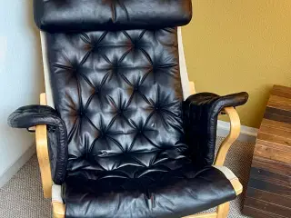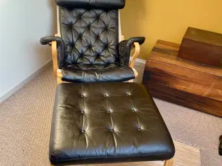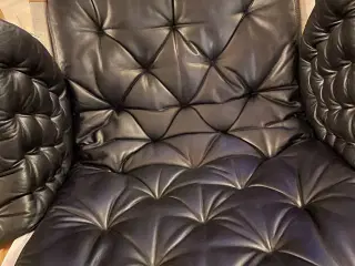 2 stk. Klassiske højryggede lænestole samt 1 fodskammel i moderne design i læder fra Stouby Højde 110 cm Bredde 62 cm Dybde sæde 54 cm Bredde sæde 50 cm Sidde højde 45 cm Total længde 81 cm