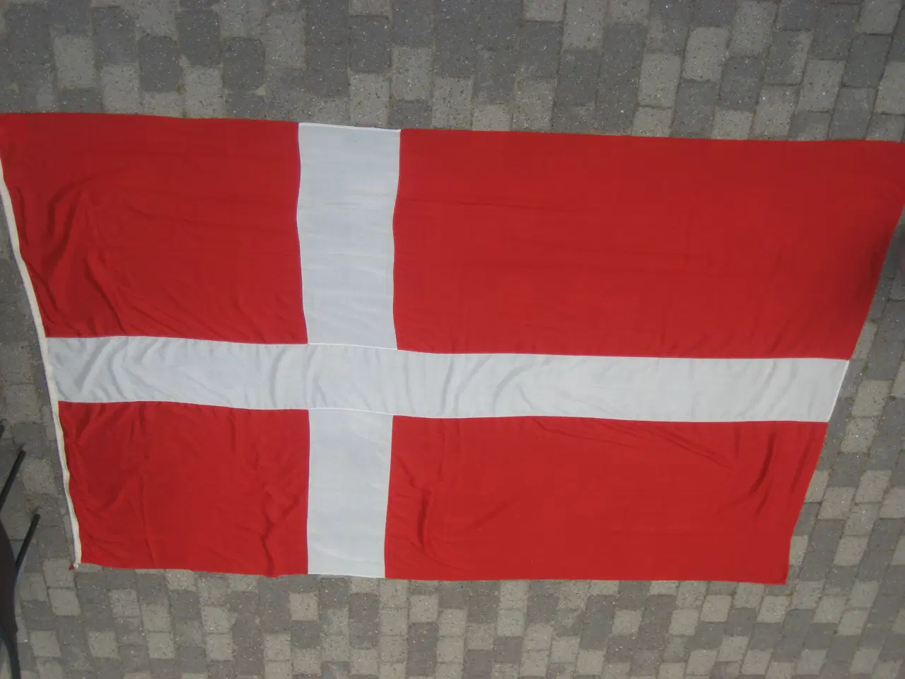 Stort dannebrogsflag sælges. Måler 3,2 m x 2,4 m og passer dermed til en flagstang på 12 meter. Materialet er nok polyester.